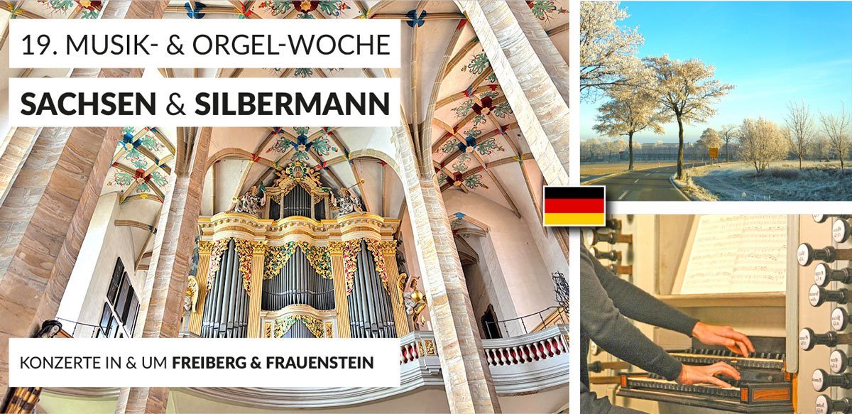 Die 19. Musik- & Orgelwoche „ERZGEBIRGE & ELBE“ entführt Sie in die wunderbare Orgellandschaft der Gebrüder SILBERMANN, zu Konzerten & Sehenswürdigkeiten im Erzgebirge sowie in der Kultur- & Musikstadt Dresden!
