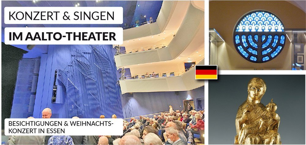 Nur drei Tage vor Weihnachten laden wir Sie zu einem ganz besonders stimmungs- & stimmvollen Ausflug ein! Denn: Überall auf der Welt wird Weihnachten gefeiert und jedes Land hat dafür seine eigenen Traditionen. Ob Küsse unterm Mistelzweig (England), Weihnachtsschwimmen im eiskalten Meer (Irland) oder Spinnennetze im Tannenbaum (Ukraine) – eines haben alle gemeinsam: Es wird gesungen, was das Zeug hält. In dieser Tradition laden wir zum Lauschen und Mitsingen ein, wenn die Solist*innen und Chöre des Aalto-Theaters zu den Klängen der Essener Philharmoniker ihre Stimmen erheben - und Sie auffordern: ES DARF KRÄFTIG MITGESUNGEN WERDEN! Am Vormittag des vierten Adventsonntag bieten wir Ihnen in Essen die Möglichkeit zum Besuch der Hl. Messe im Essener Münster (oder alternativ: zum Besuch der Schatzkammer oder der nahen Synagoge zu Essen) und zur Mittagszeit den Aufenthalt auf dem Weihnachtsmarkt in der Essener Innenstadt. Der Nachmittag gehört dann dem Weihnachtssingen im Aalto-Theater.